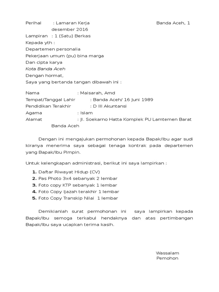 Untuk itu tak lupa saya menyampaikan banyak terima kasih. Contoh surat lamaran kerja adalah sebuah contoh surat lamaran untuk mendaftar/apply sebuah pekerjaan yang kita inginkan. Contoh surat lamaran kerja honorer dinas perhubungan sebagai akunting. Contoh surat lamaran kerja sebagai admin sosmed. 4 contoh cv lamaran kerja.