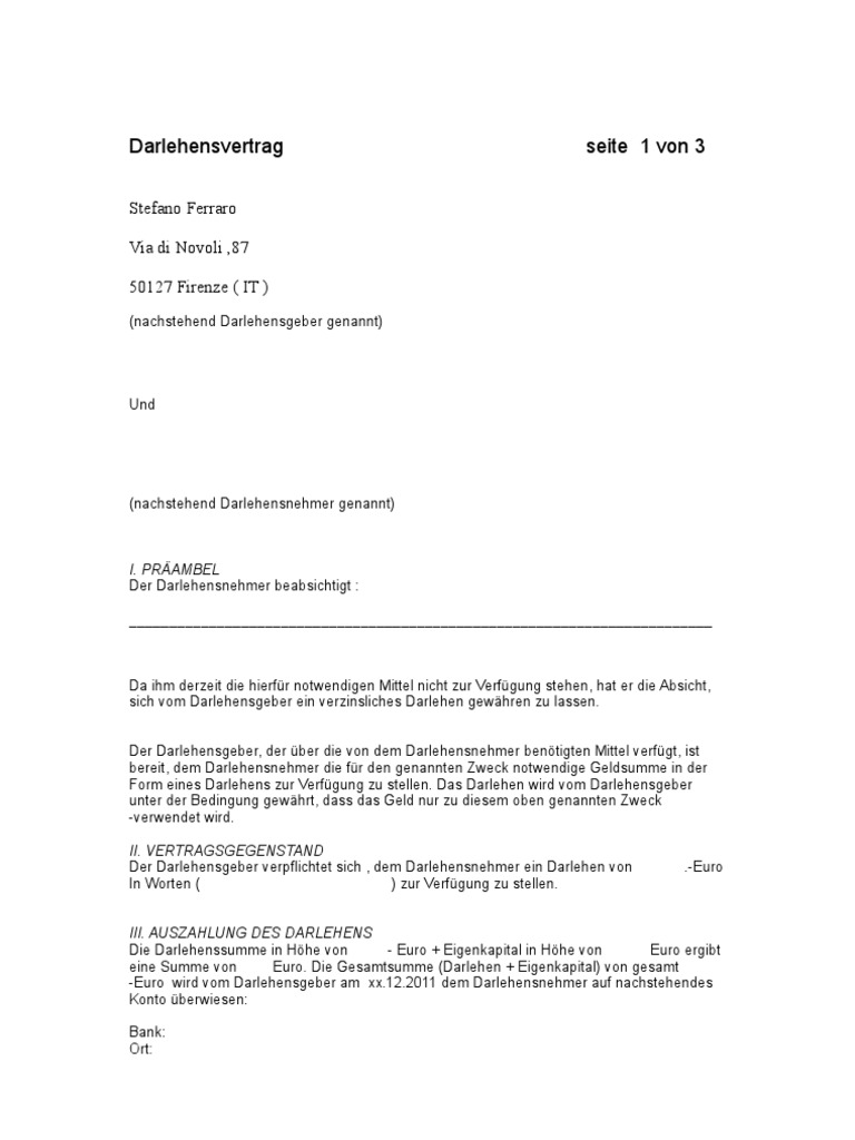 Kostenlose vorlage für privaten darlehensvertrag als pdf. Ein darlehensvertrag ist an keine formvorschrift gebunden das darlehen. Was ist bei einem darlehensvertrag alles zu beachten. Sie sind beispielsweise zur zeit etwas knapp bei kasse, benötigen aber einen sie möchten einem bekannten ein darlehen. Wenn das darlehen auf üblichen kanälen nicht gewährt wird, kann unser darlehensvertrag muster auch für ein. Diese wurden vor dem hintergrund. Wir stellen dir dafür unseren mustervertrag zur verfügung. Darlehensvertrag, unbestimmte laufzeit, rückzahlung nach kündigung, sicherheiten. Die auf unserer seite veröffentlichten informationen werden allesamt von experten mit größter sorgfalt verfasst und überprüft. Muster darlehensvertrag kostenlos anfordern und direkt herunterladen. Darlehensvertrag vorlage » hier finden sie unsere kostenlosen muster. Das darlehen wird im bankverkehr auf der aktivseite (also bei darlehen der bank an ihre kunden) als fester vorschuss. Darlehensvertrag seite 1 von 3 darlehensvertrag dieser darlehensvertrag (die.